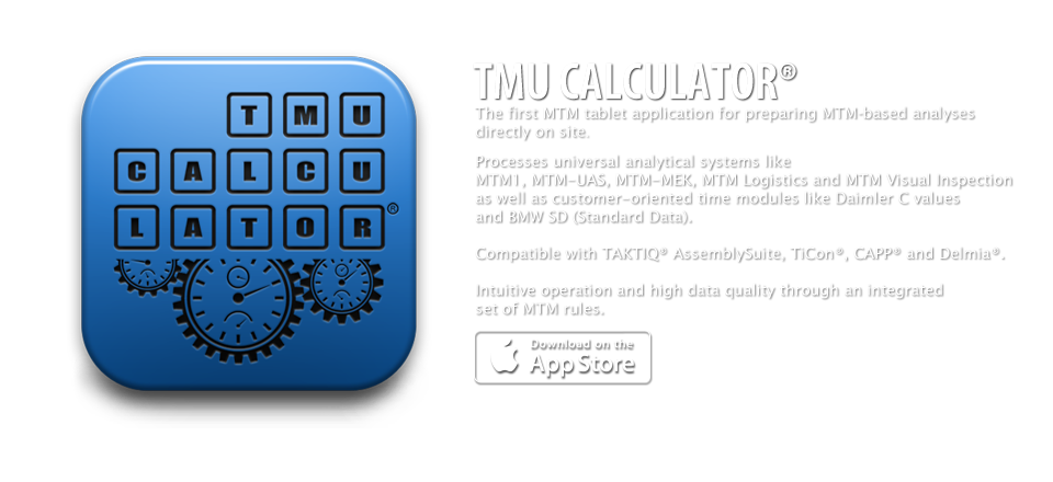 The TMU CALCULATOR® processes MTM-1®, MTM-UAS®, MTM-SD® and MTM-LOG® systems and is compatible with TiCon, CAPP, Delmia or TAKTIQ AssemblySuite.