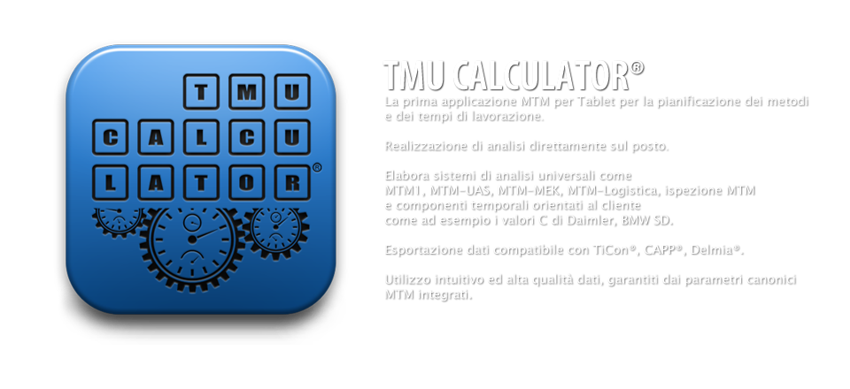 Il TMU CALCULATOR® elabora MTM-®1, MTM-UAS®, MTM-SD® o MTM-LOG® (Logistica) ed è compatibile con sistemi di acquisizione quali TiCon, CAPP, Delmia, o TAKTIQ AssemblySuite, che permettono un risparmio di tempo.